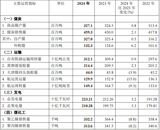 中国神华以煤炭产品为基础,形成的煤炭“生产——运输(铁路、港口、航运)——转化(发电及煤化工)”一体化运营模式,具有链条完整、协同高效、安全稳定、低成本运营等优势。2024 年,公司深入践行能源安全新战略,保持煤炭稳产高产,畅通路港航运输大通道,实现一体化平稳高效运营,煤炭产销量、发电量等指标达成年度目标。